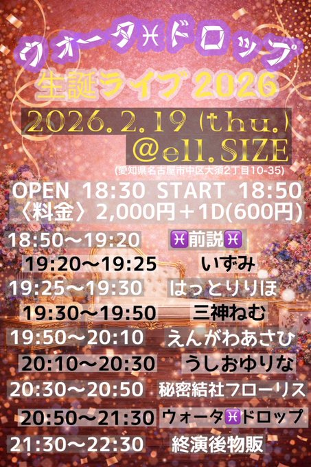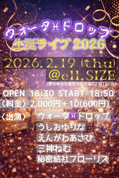 対バンイベントに出演★ウォータ♓️ドロップ生誕ライブ2026 会場 : ell.SIZE 2026/02/19 木 OPEN / START 18:30 / 18:50 2026.02.19(木) ウォータ♓️ドロップ生誕ライブ2026 @ ell.SIZE 料金2000円+(D代) 18:30開場 18:50開演 ウォータ♓︎ドロップ うしおゆりな えんがわあさひ 三神ねむ 秘密結社フローリス 来場予約↓ http://tiget.net/events/457882